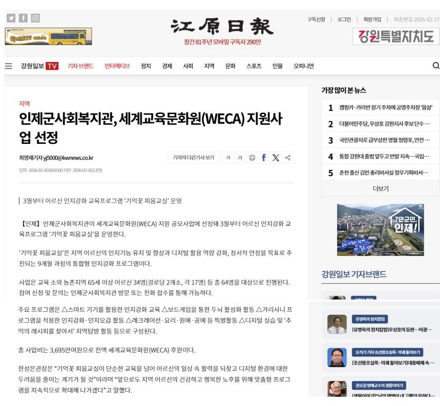 인제군사회복지관, 세계교육문화원(WECA) 지원사업 선정
